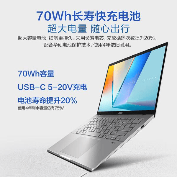 此外,华硕无畏Pro14还配备了AI摄像头和IR人脸识别,视频通话和免密登录都很方便快捷。续航方面,70Wh电池的表现也不错,基本能支持一天的使用。机身轻巧,重1.37kg,厚度仅1.59cm,便于携带,适合经常出门的用户。安静的背光键盘和沉浸式音响体验也相当舒适,虽然散热表现稍有不足,但整体表现依然令人满意。