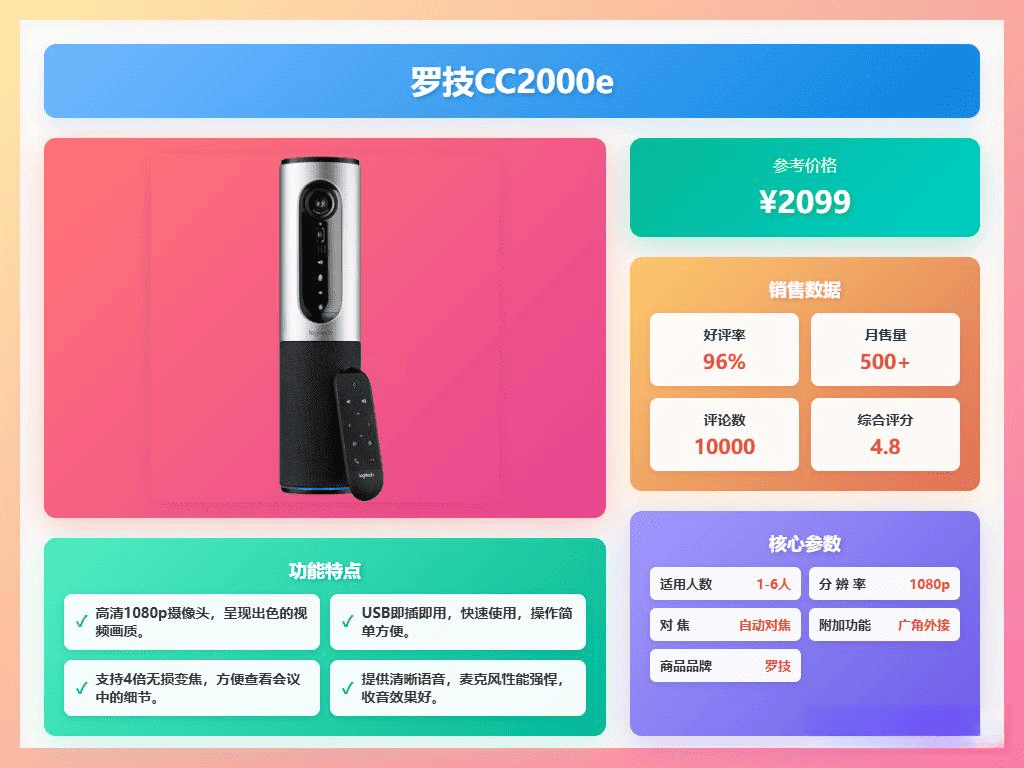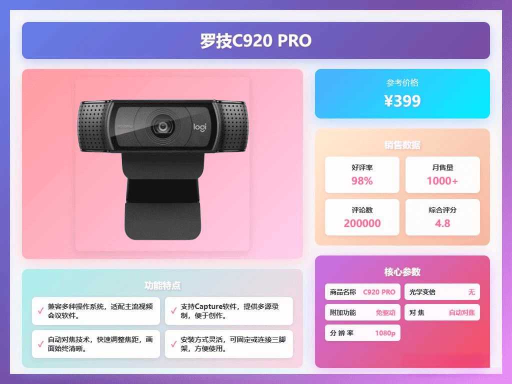 ▶高清1080p画质:支持1080p分辨率,画面清晰流畅,适合视频会议。